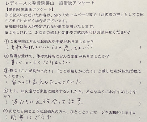 かなり丁寧にしていただいて、頭だけじゃなく首も楽になりました。